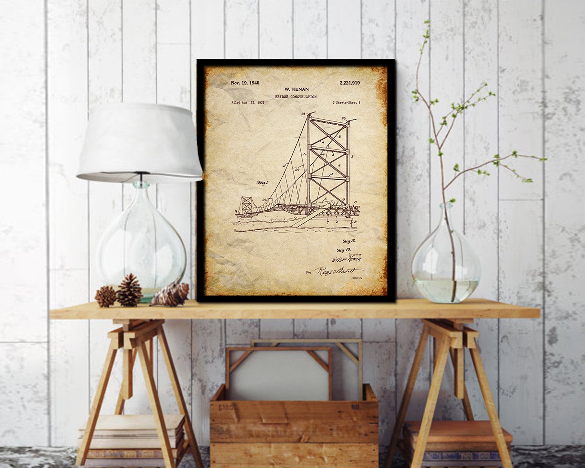 Construction Bridge Vintage Patent Artwork Walnut Frame Print Wall Art Decor Gifts