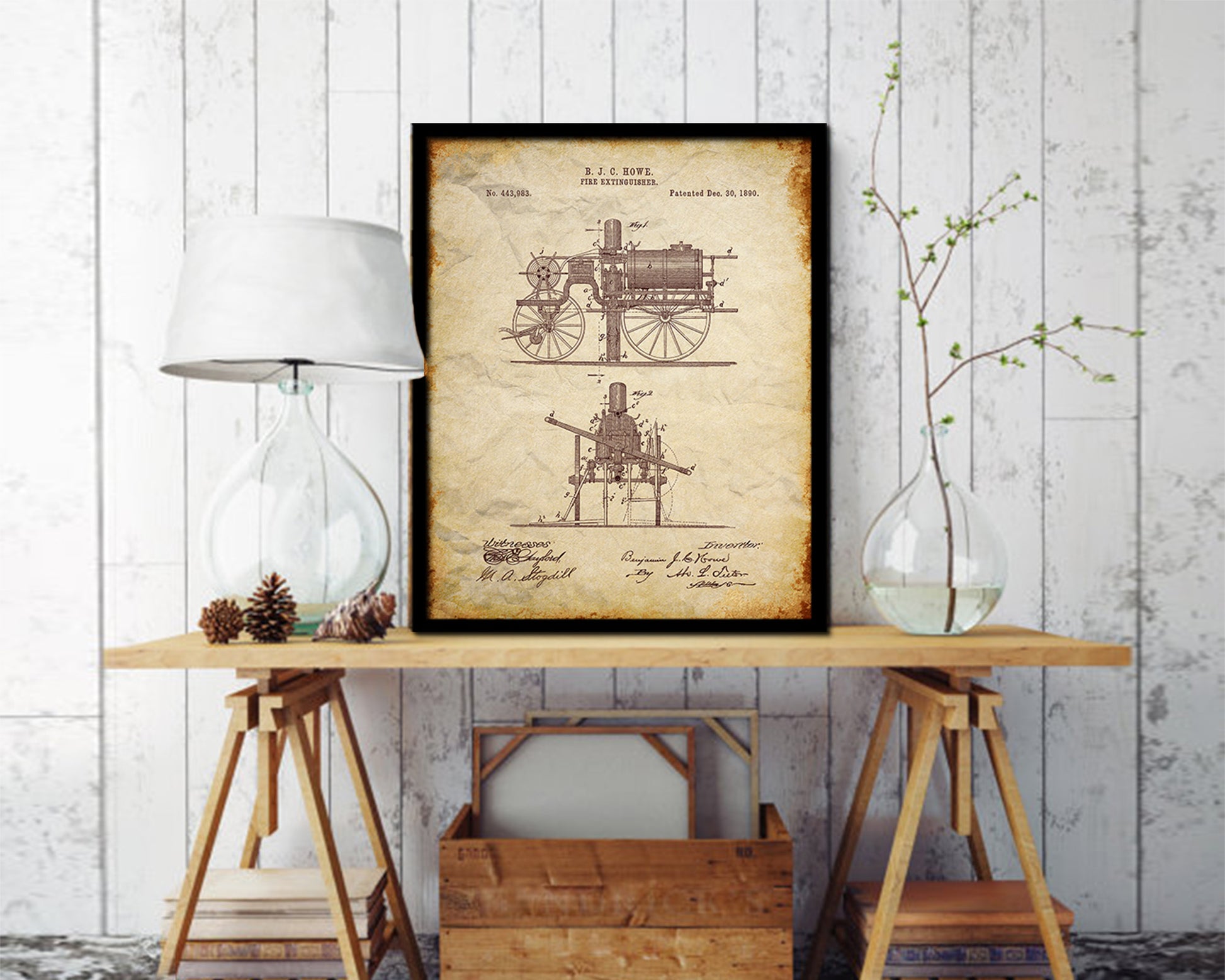Fire Extinguisher Firefighter Vintage Patent Artwork Walnut Frame Gifts