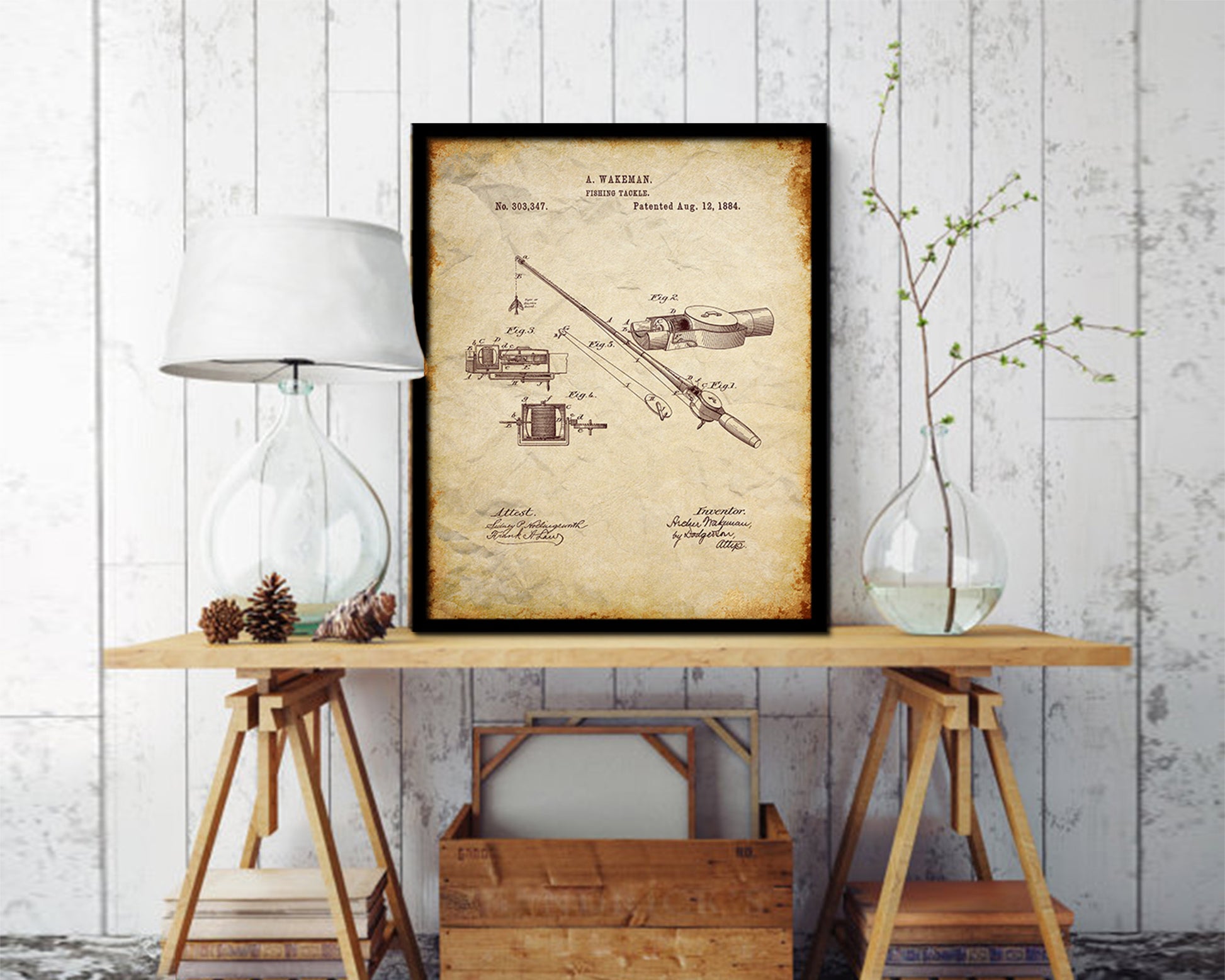 Tackle Fishing Vintage Patent Artwork Walnut Frame Print Wall Art Decor Gifts