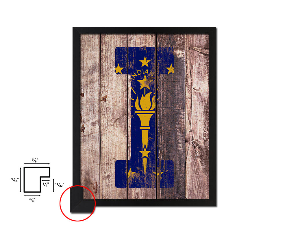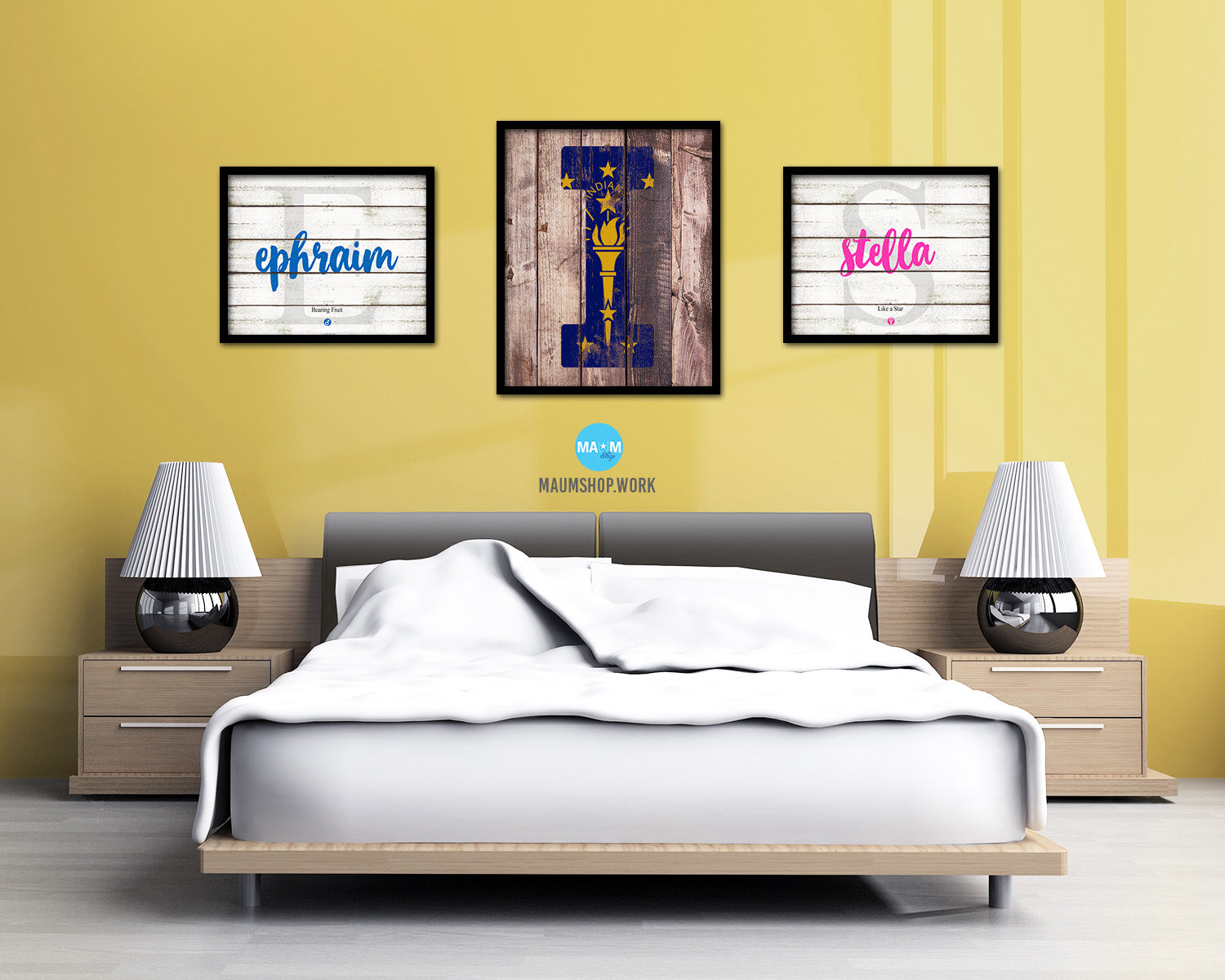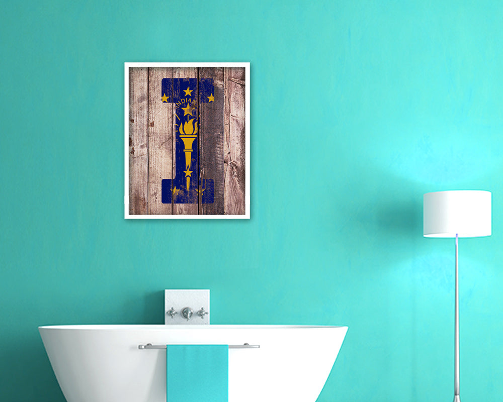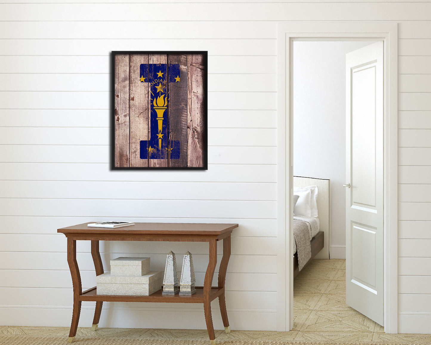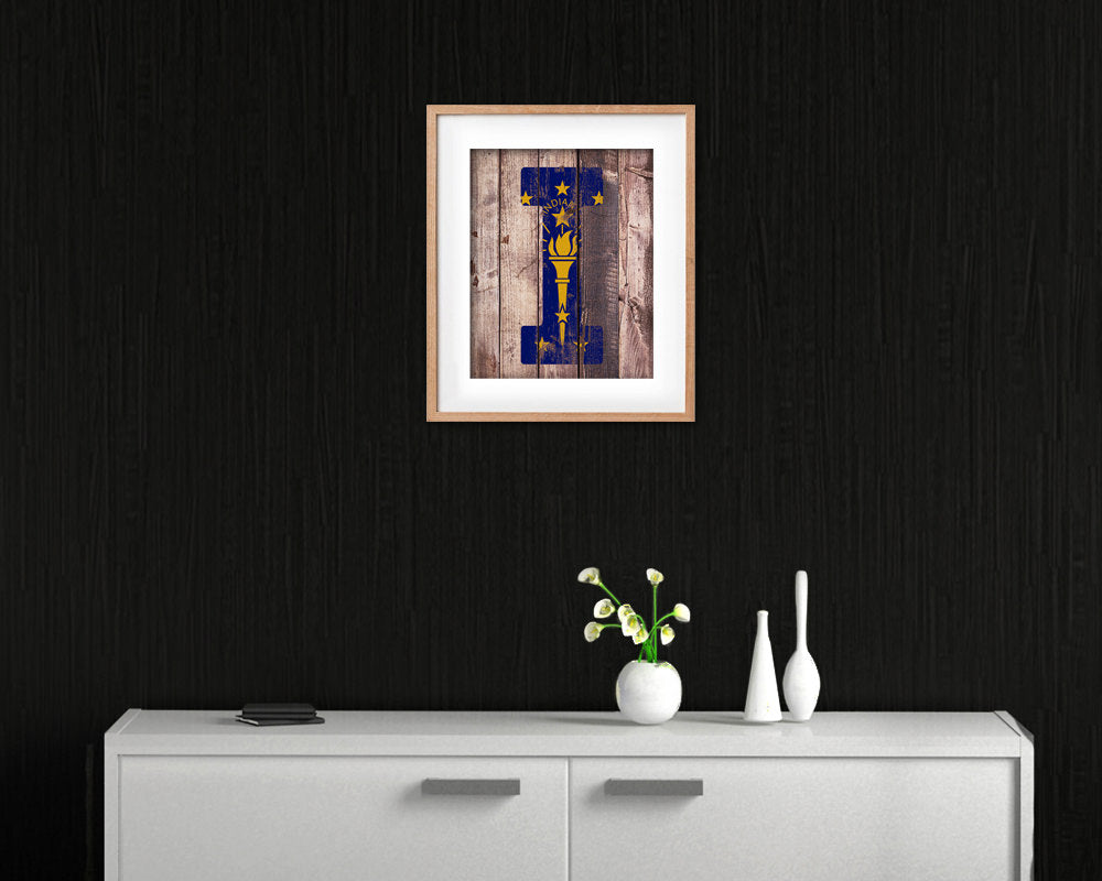 Indiana State Initial Flag Wood Framed Paper Print Decor Wall Art Gifts, Wood