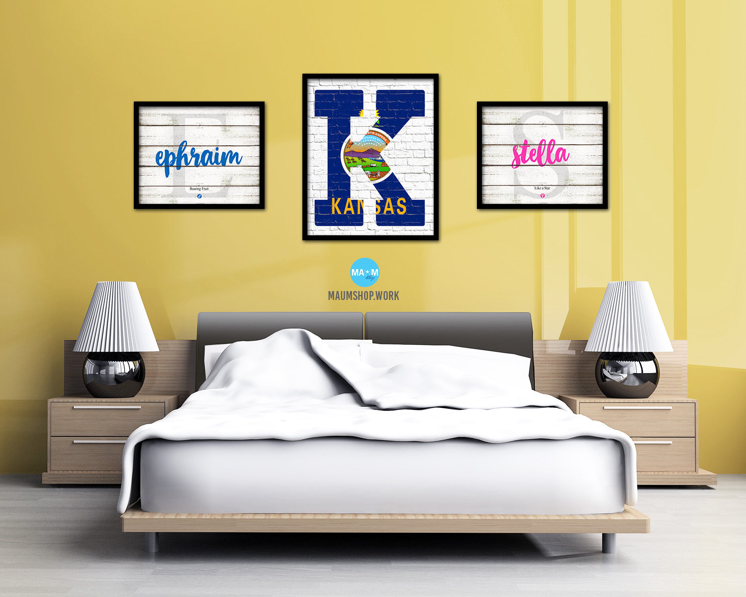 Kansas State Initial Flag Wood Framed Paper Print Decor Wall Art Gifts, Brick