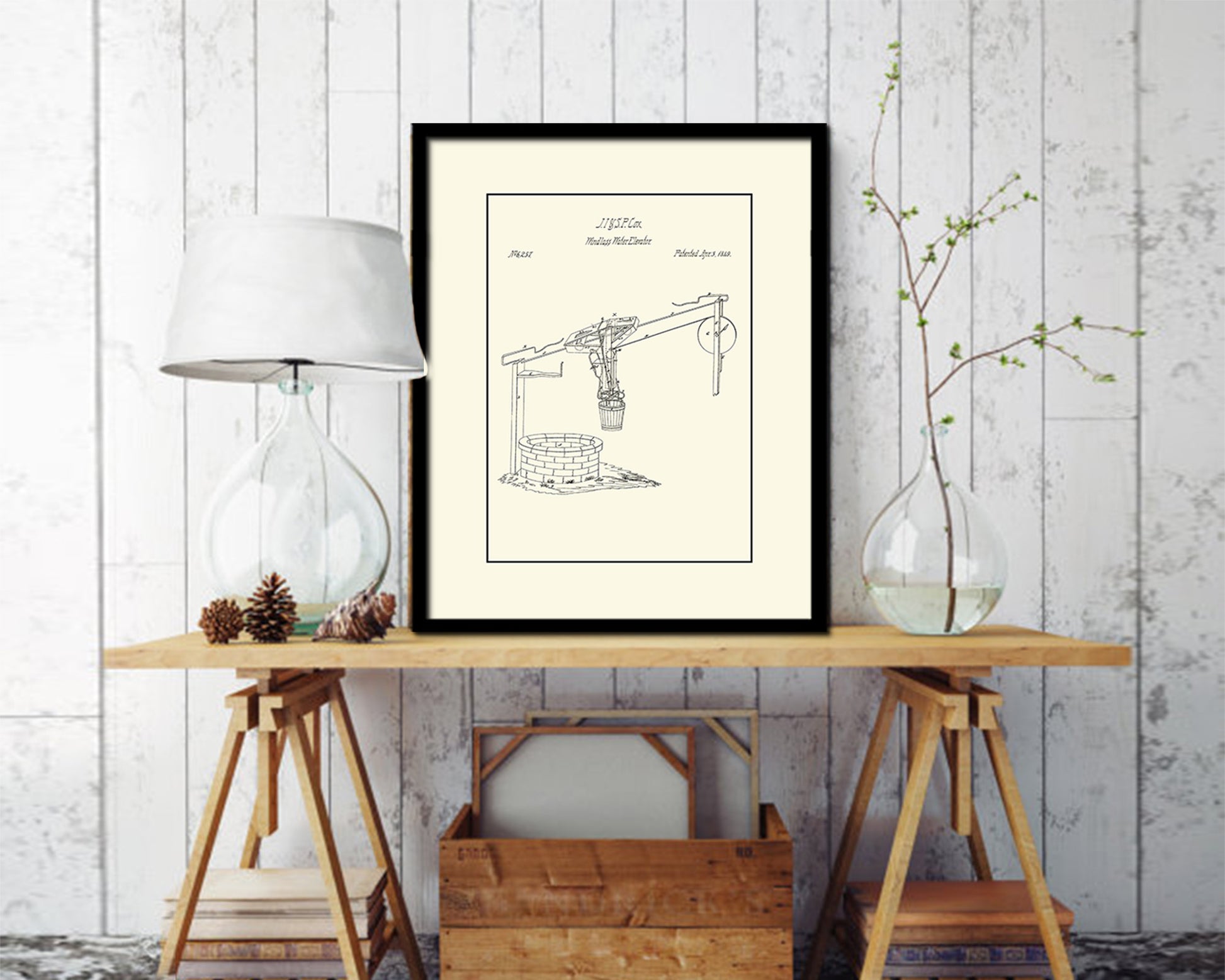 Windlass Water Elevator Kitchen Vintage Patent Artwork Black Frame Print Gifts
