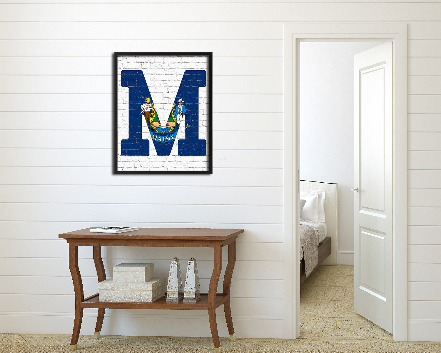 Maine State Initial Flag Wood Framed Paper Print Decor Wall Art Gifts, Brick