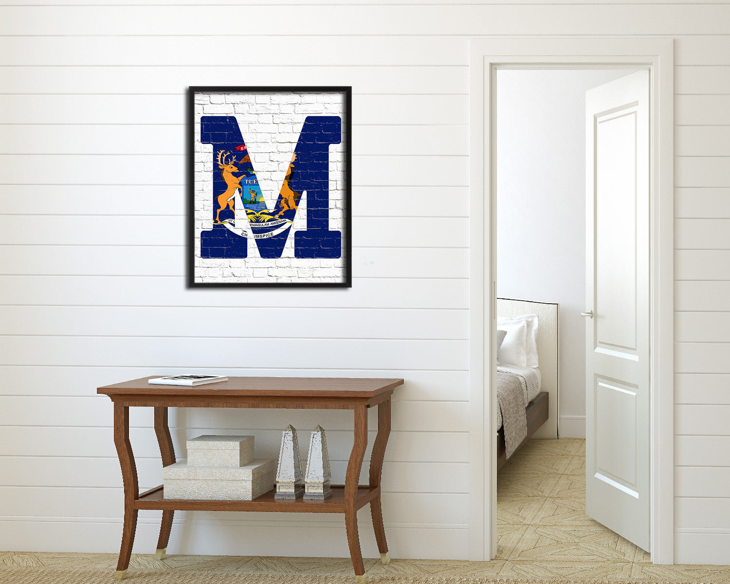 Michigan State Initial Flag Wood Framed Paper Print Decor Wall Art Gifts, Brick