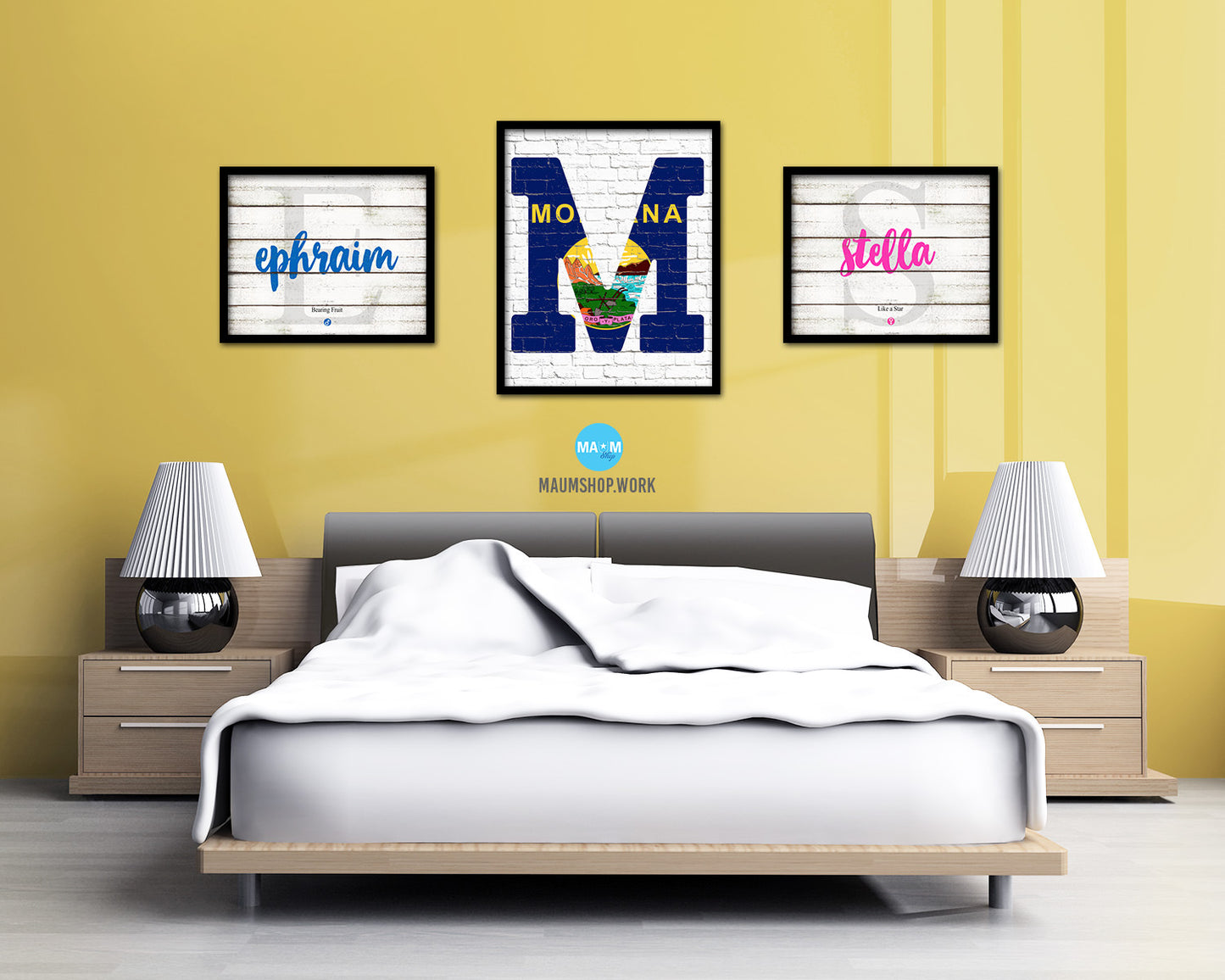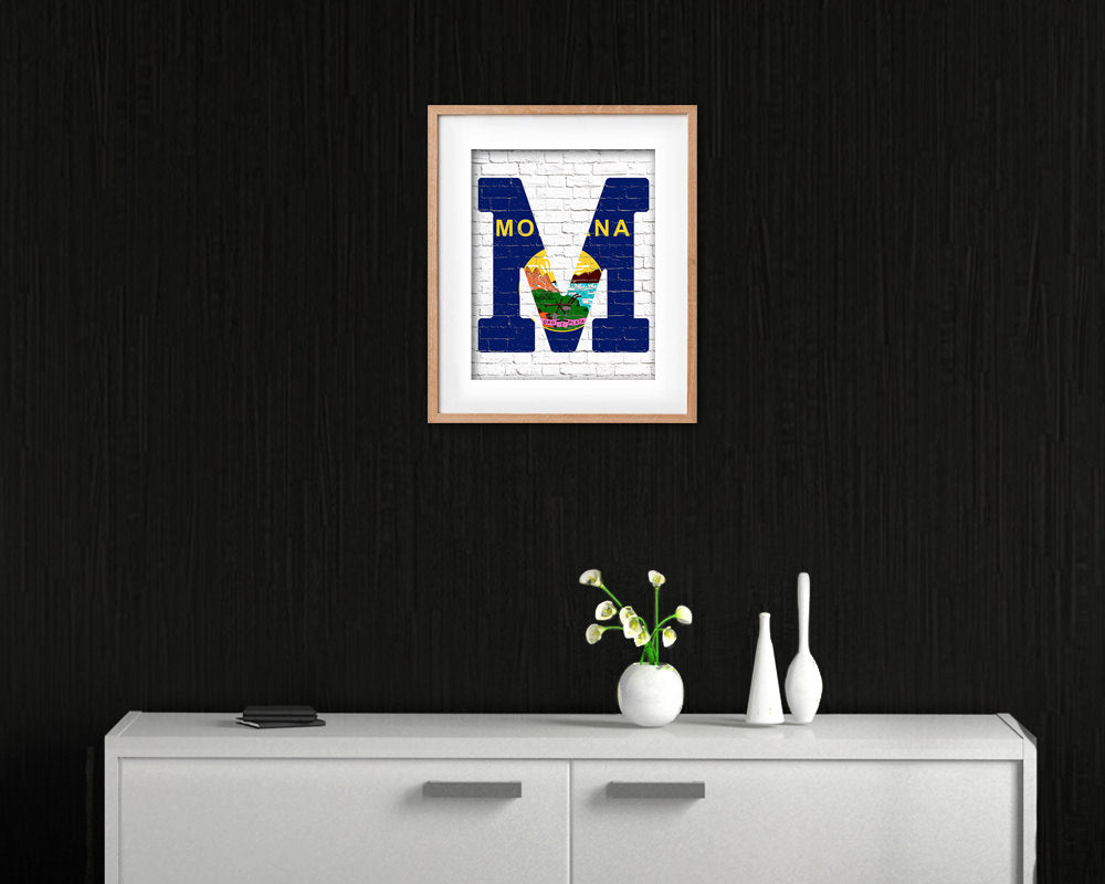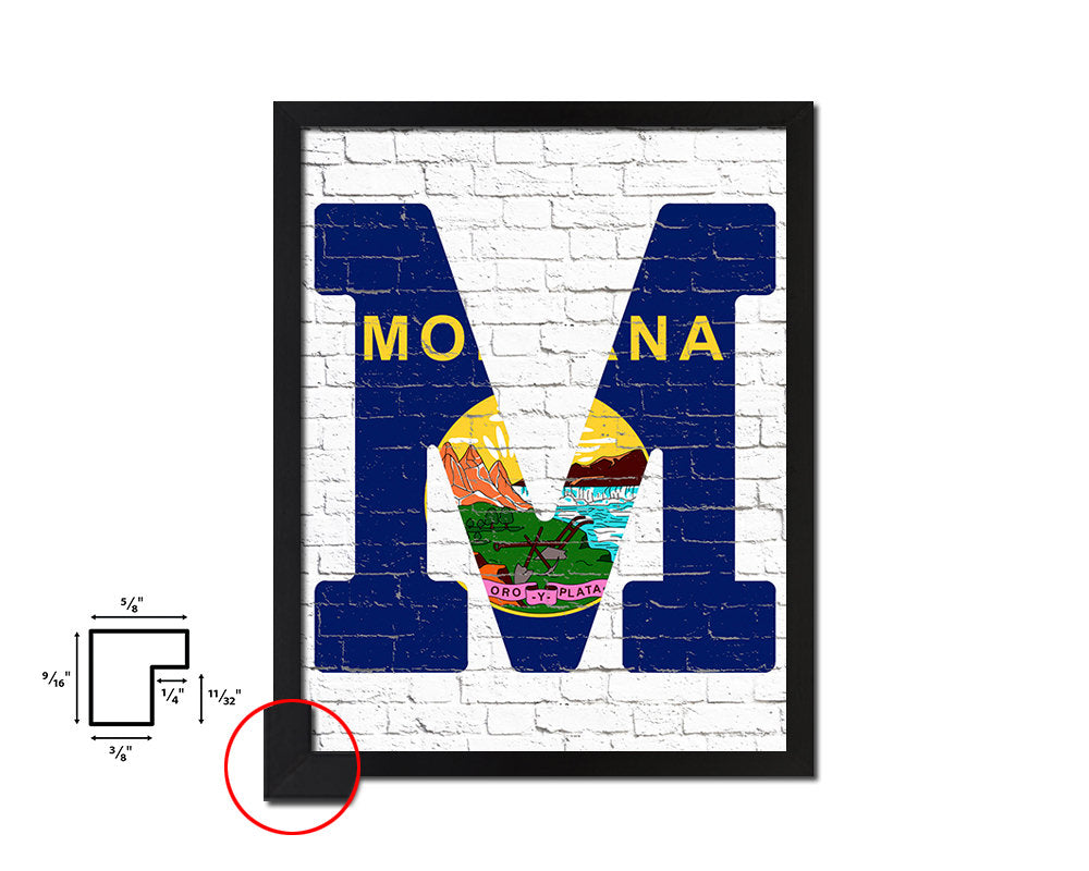 Montana State Initial Flag Wood Framed Paper Print Decor Wall Art Gifts, Brick