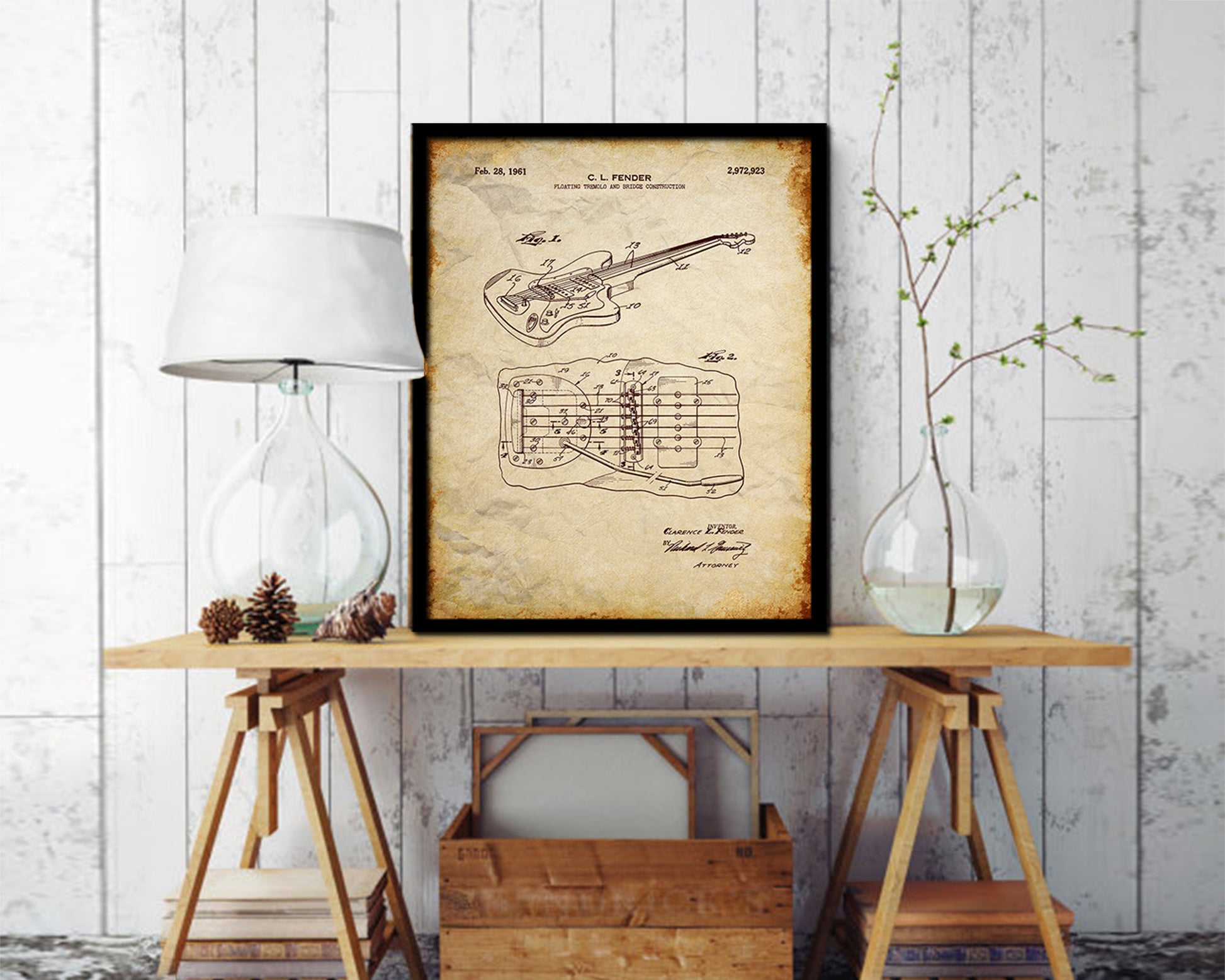 Electric Guitar Tremolo Music Vintage Patent Artwork Walnut Frame Gifts