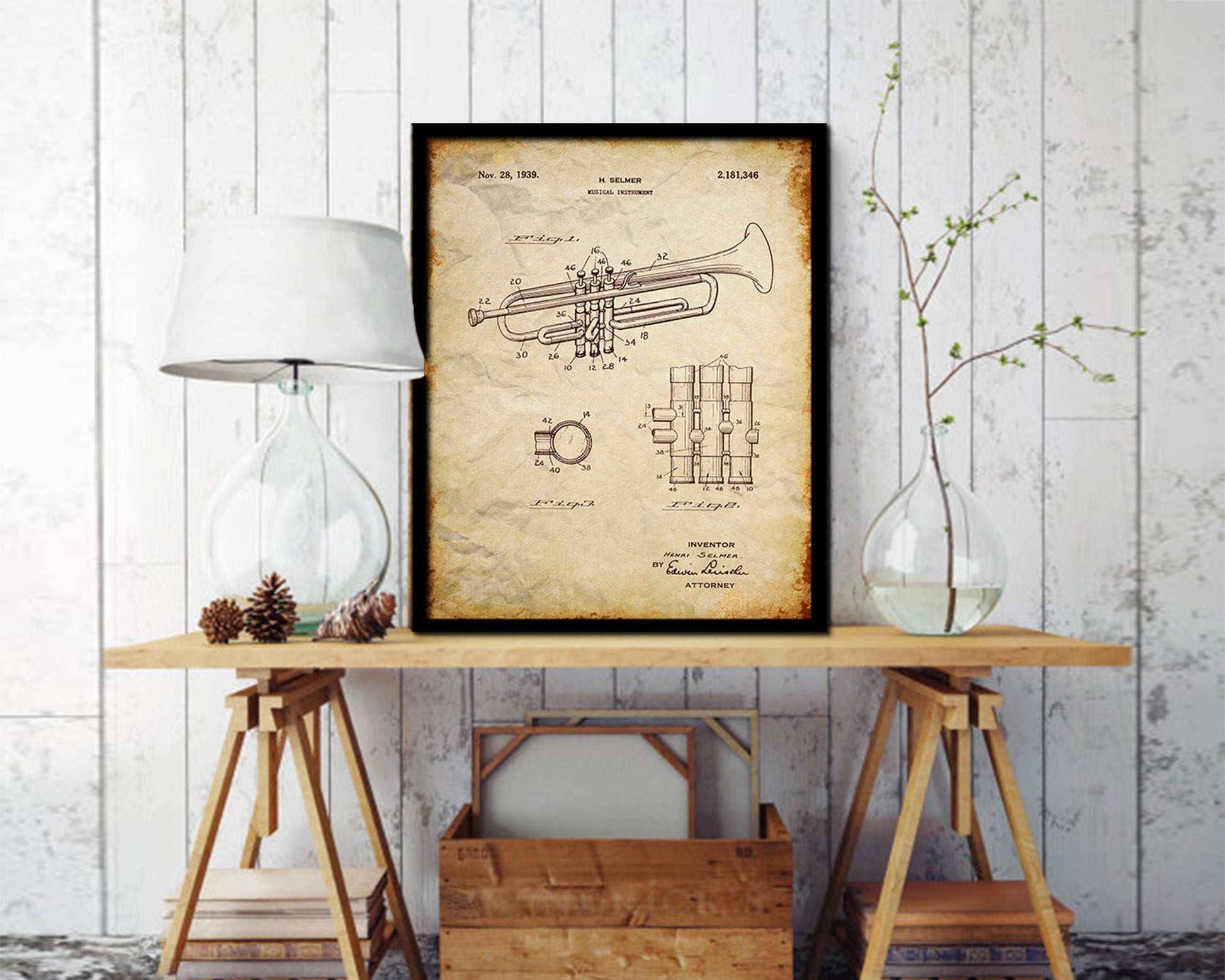 Trumpet Musical Instrument Music Vintage Patent Artwork Walnut Frame Gifts