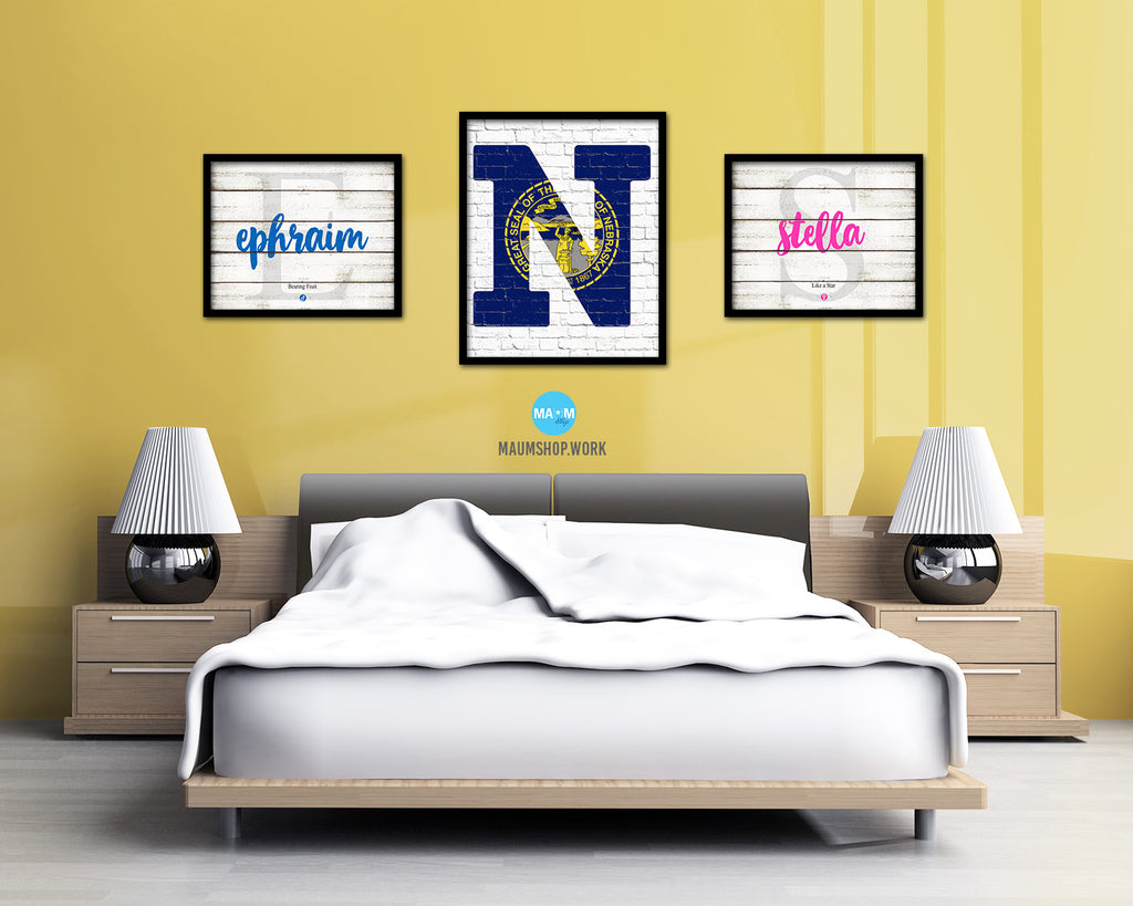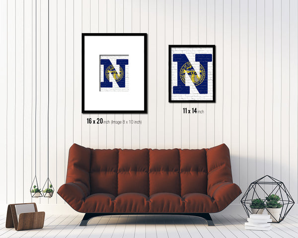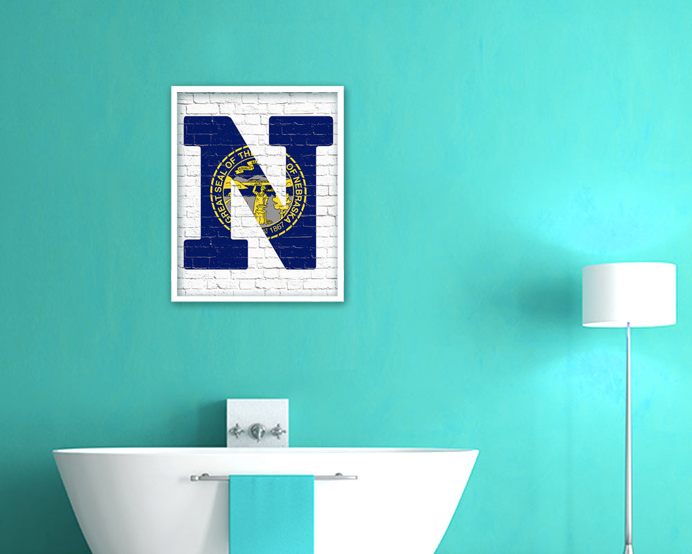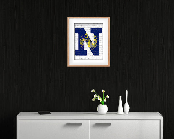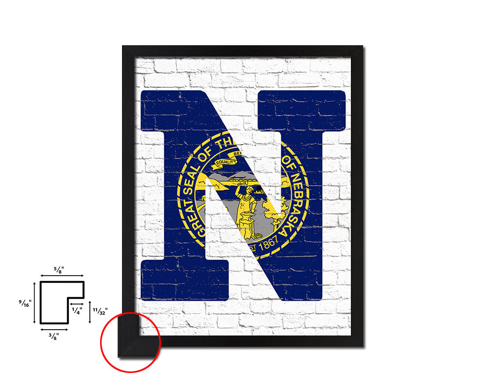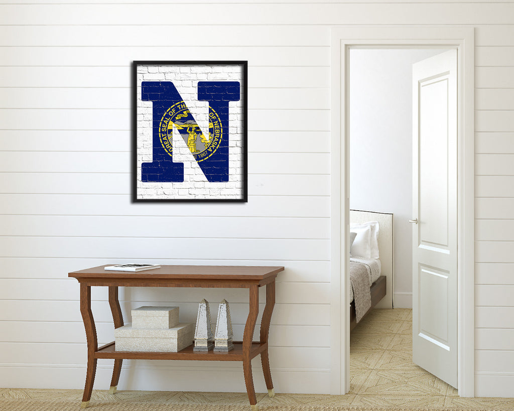 Nebraska State Initial Flag Wood Framed Paper Print Decor Wall Art Gifts, Brick