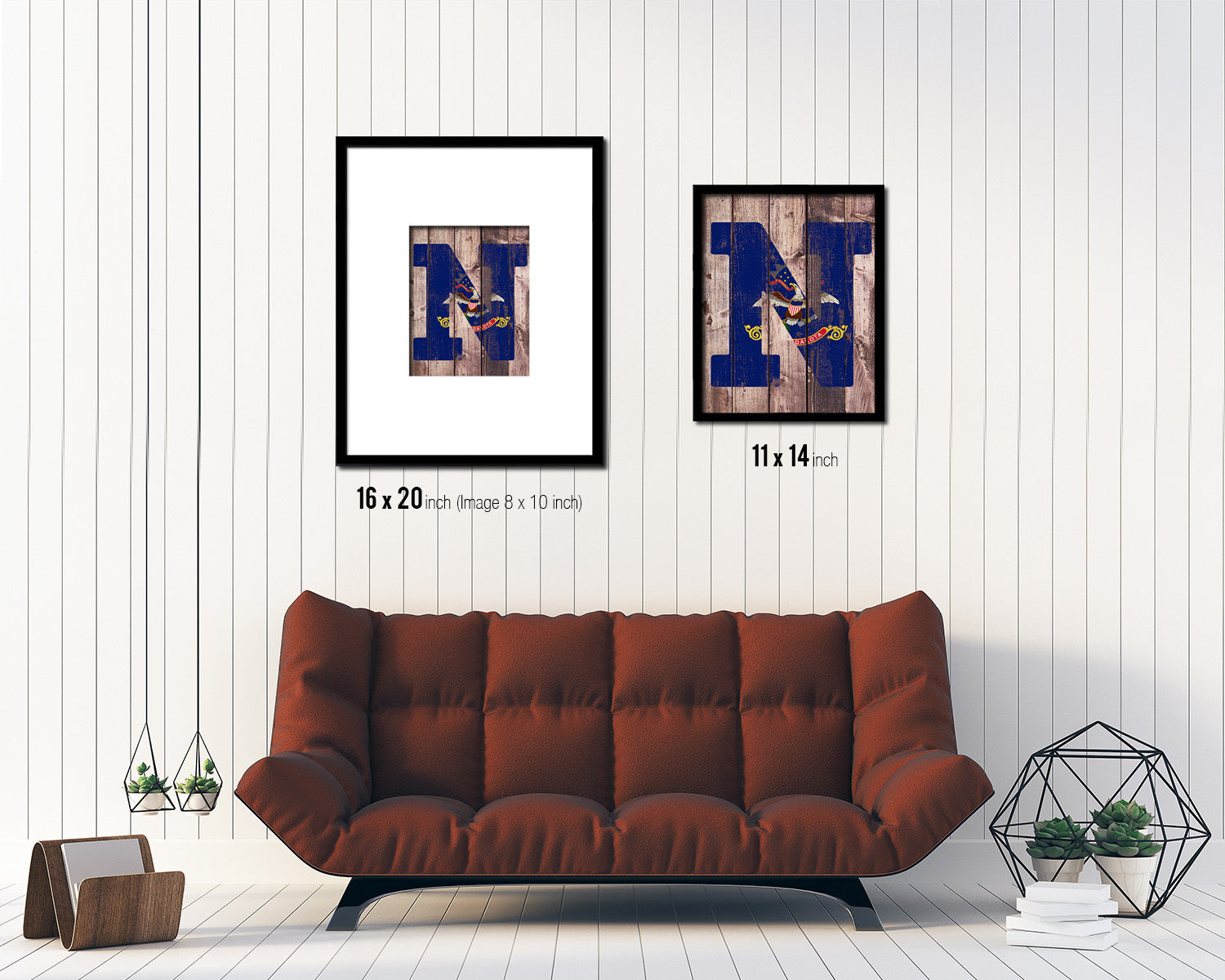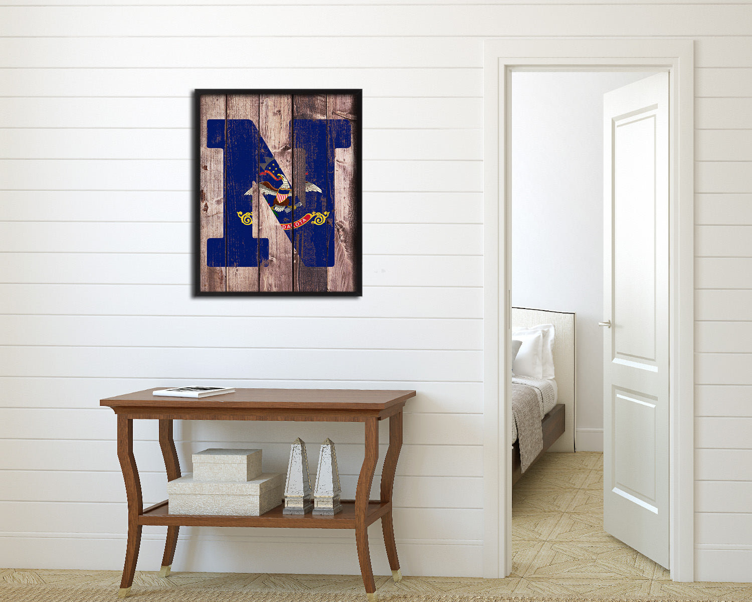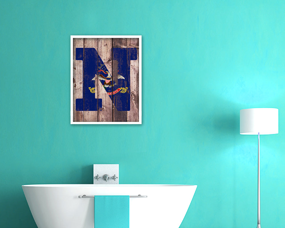 North Dakota State Initial Flag Wood Framed Paper Print Decor Wall Art Gifts, Wood
