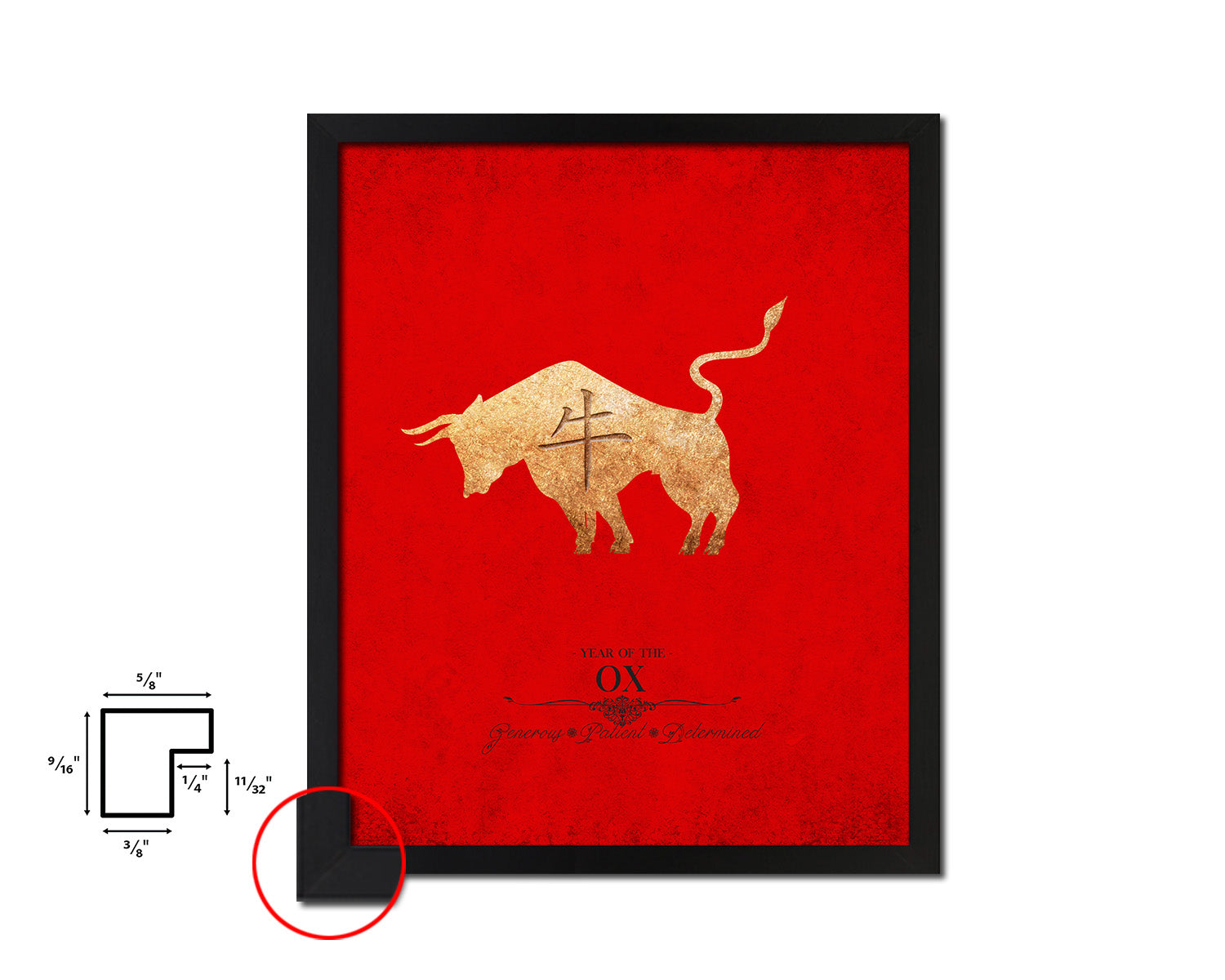 Ox Chinese Zodiac Character Black Framed Art Paper Print Wall Art Decor Gifts, Red