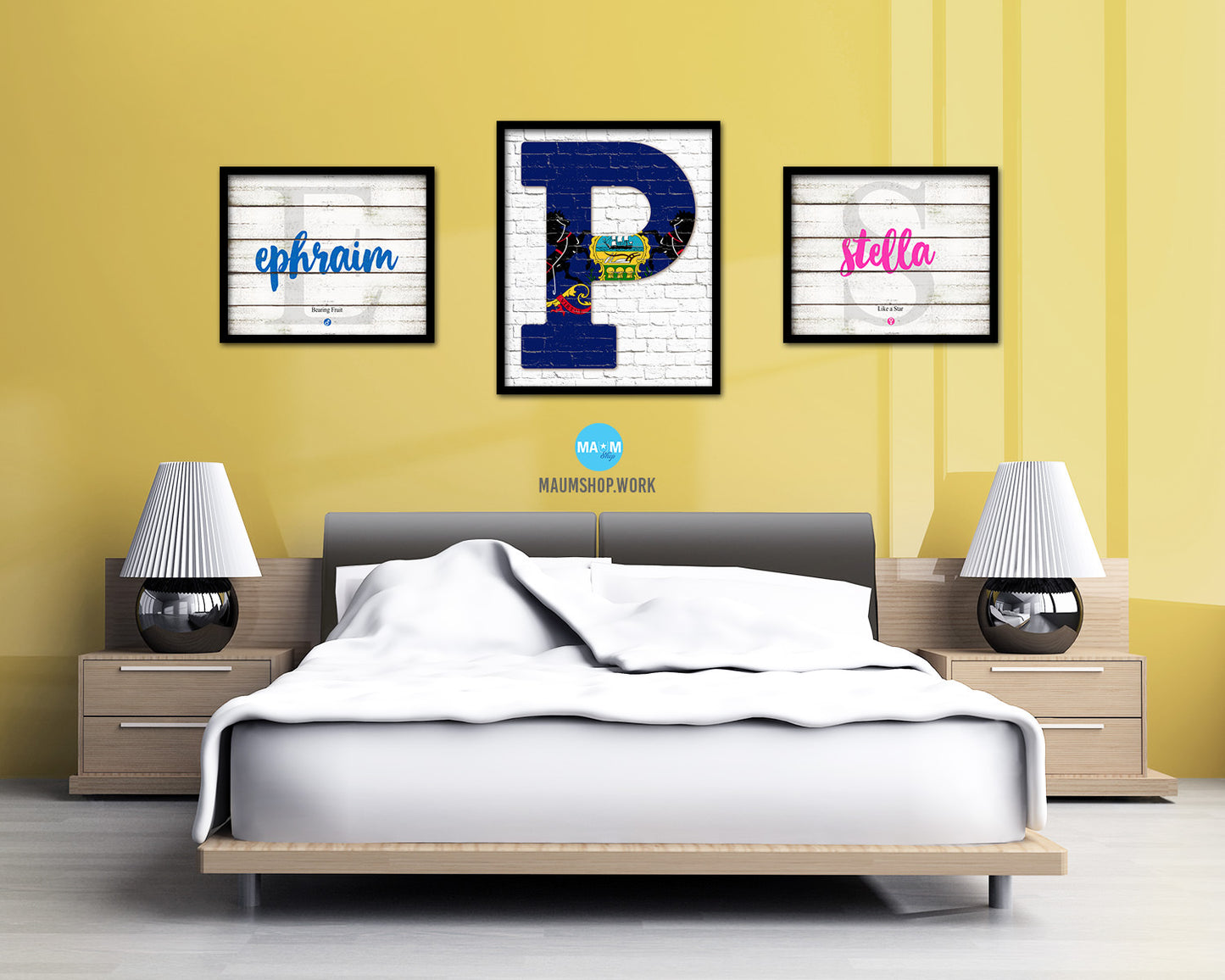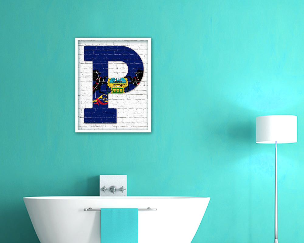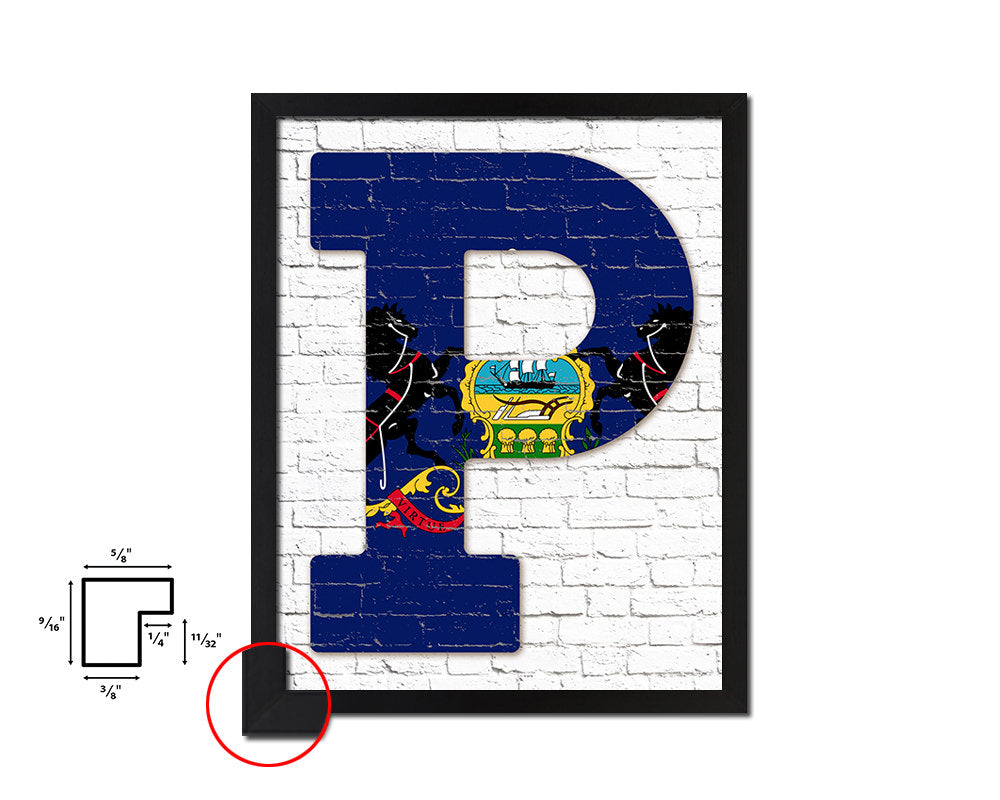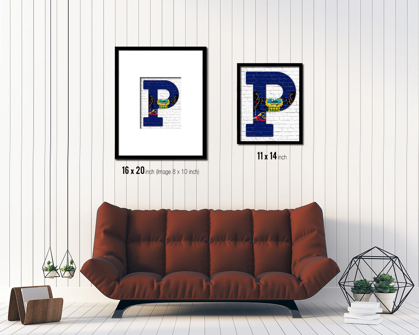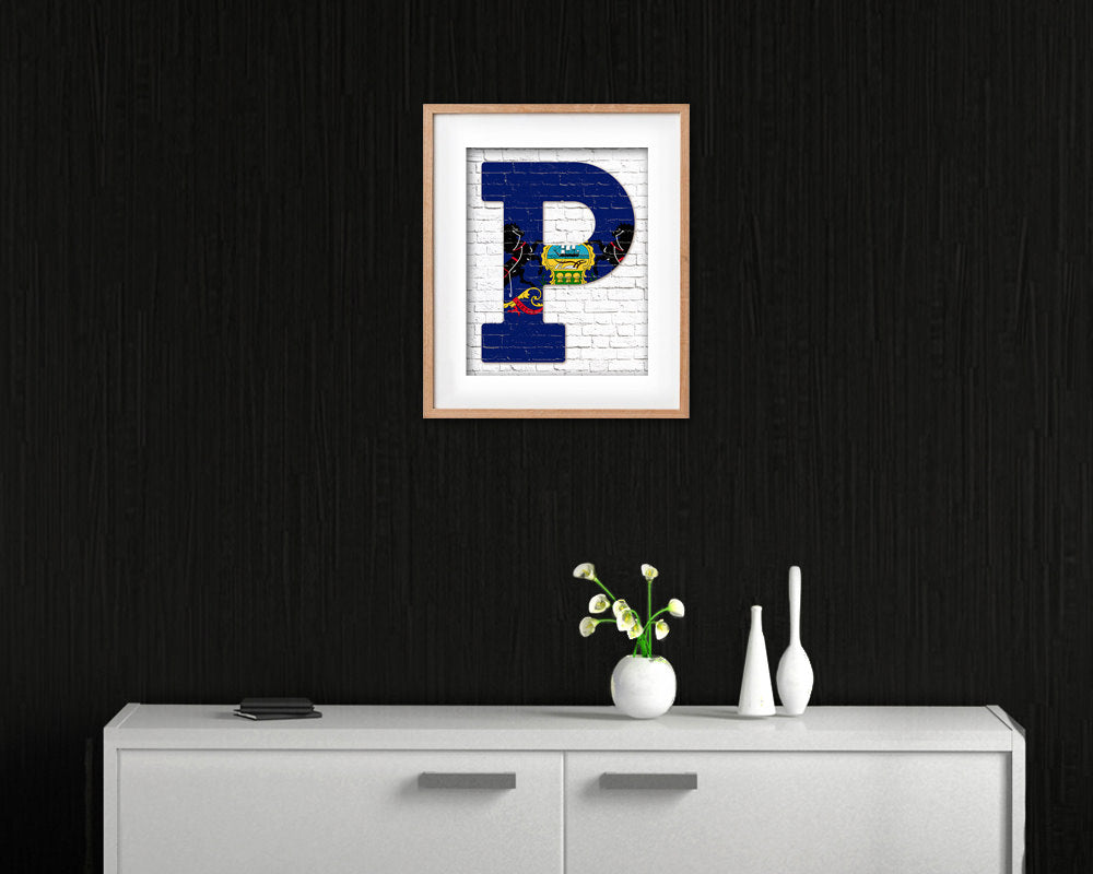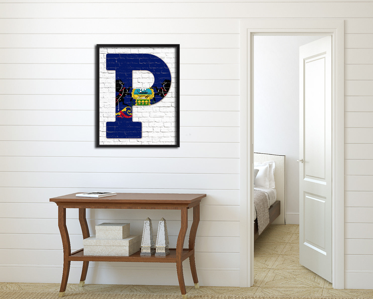 Pennsylvania State Initial Flag Wood Framed Paper Print Decor Wall Art Gifts, Brick