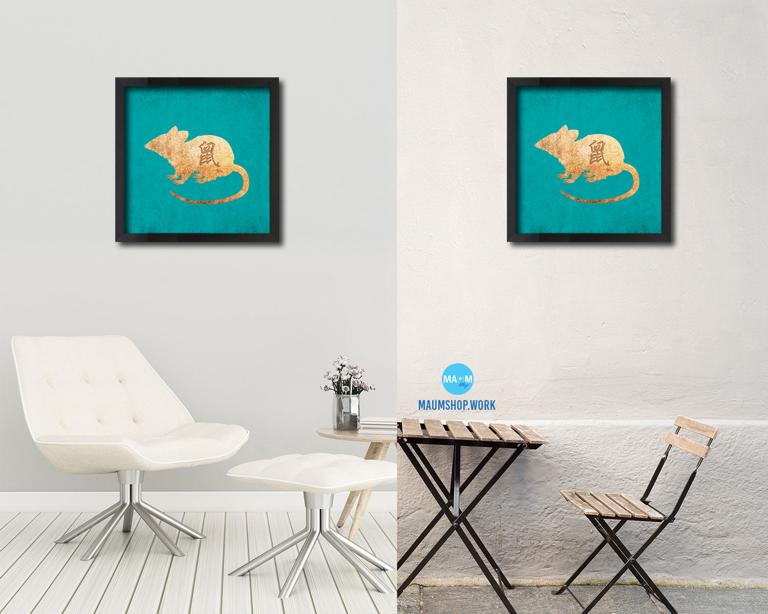 Rat Chinese Zodiac Character Wood Framed Print Wall Art Decor Gifts, Aqua