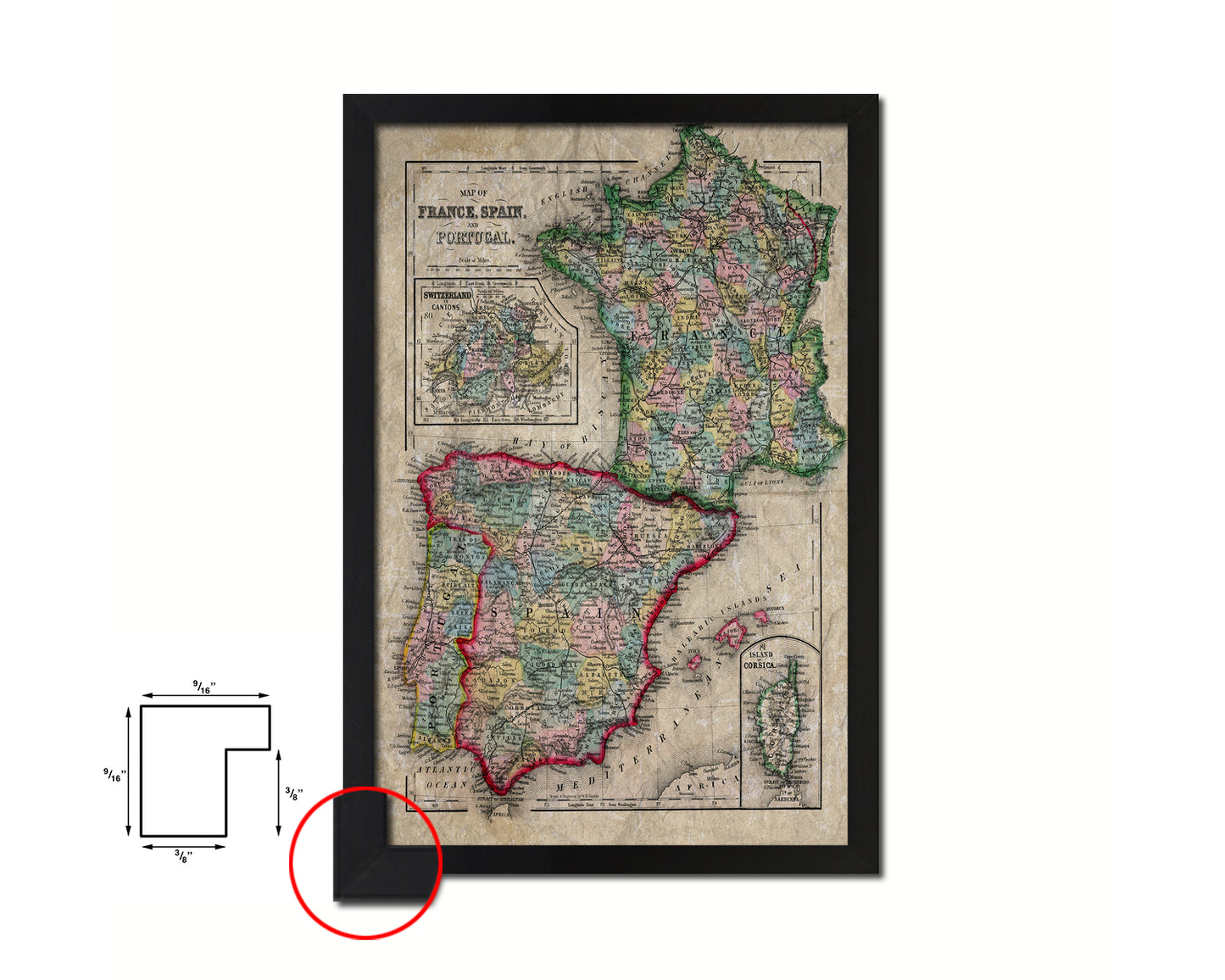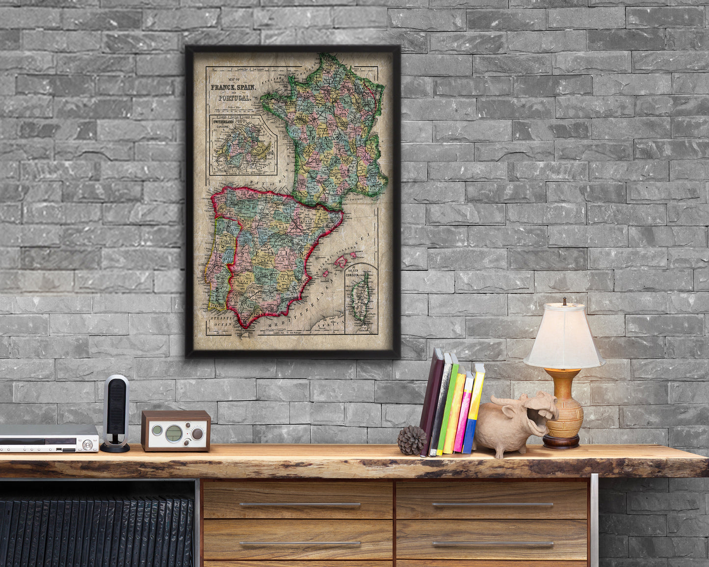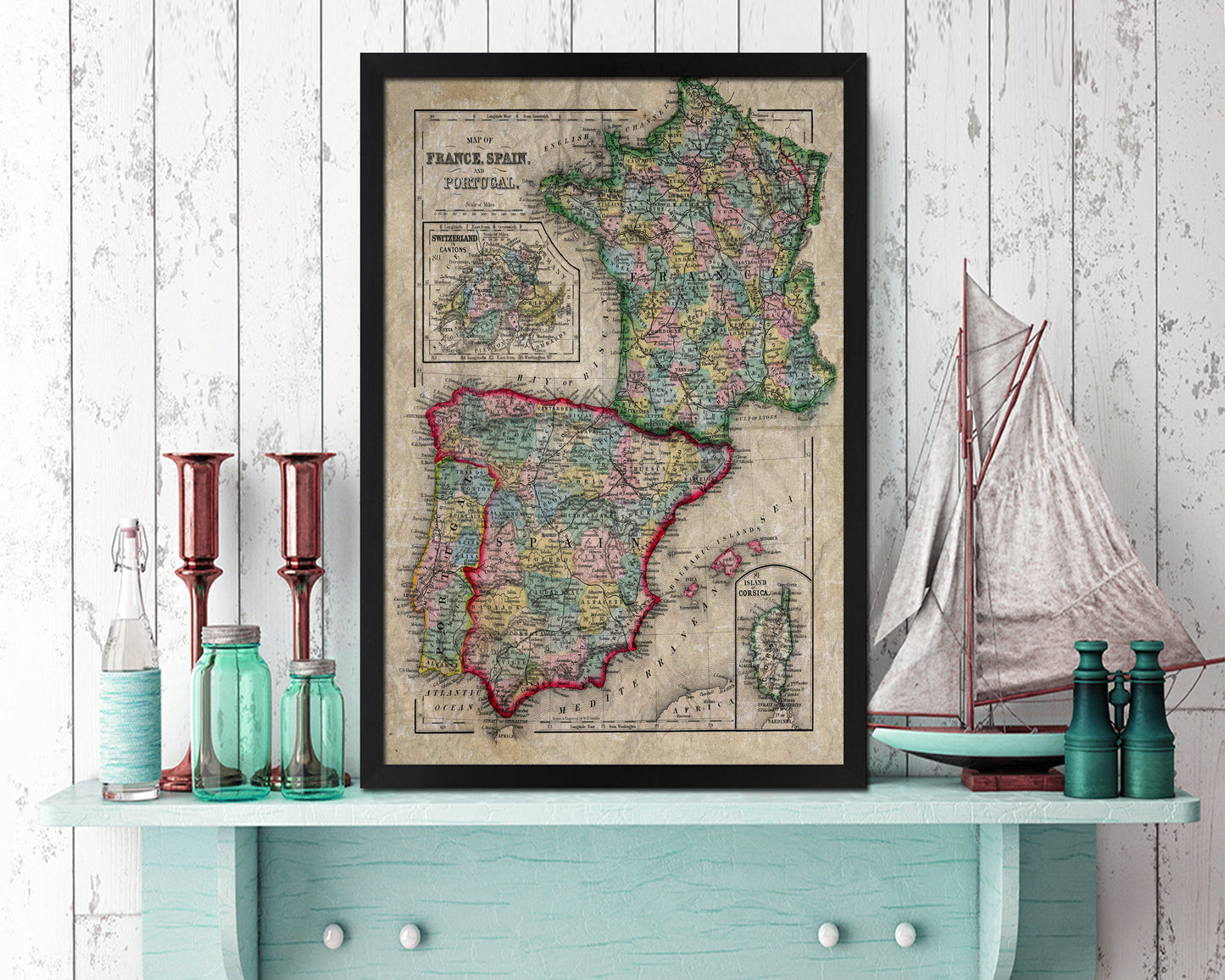 Spain Portugal and France Historical Map Wood Framed Print Art Wall Decor Gifts