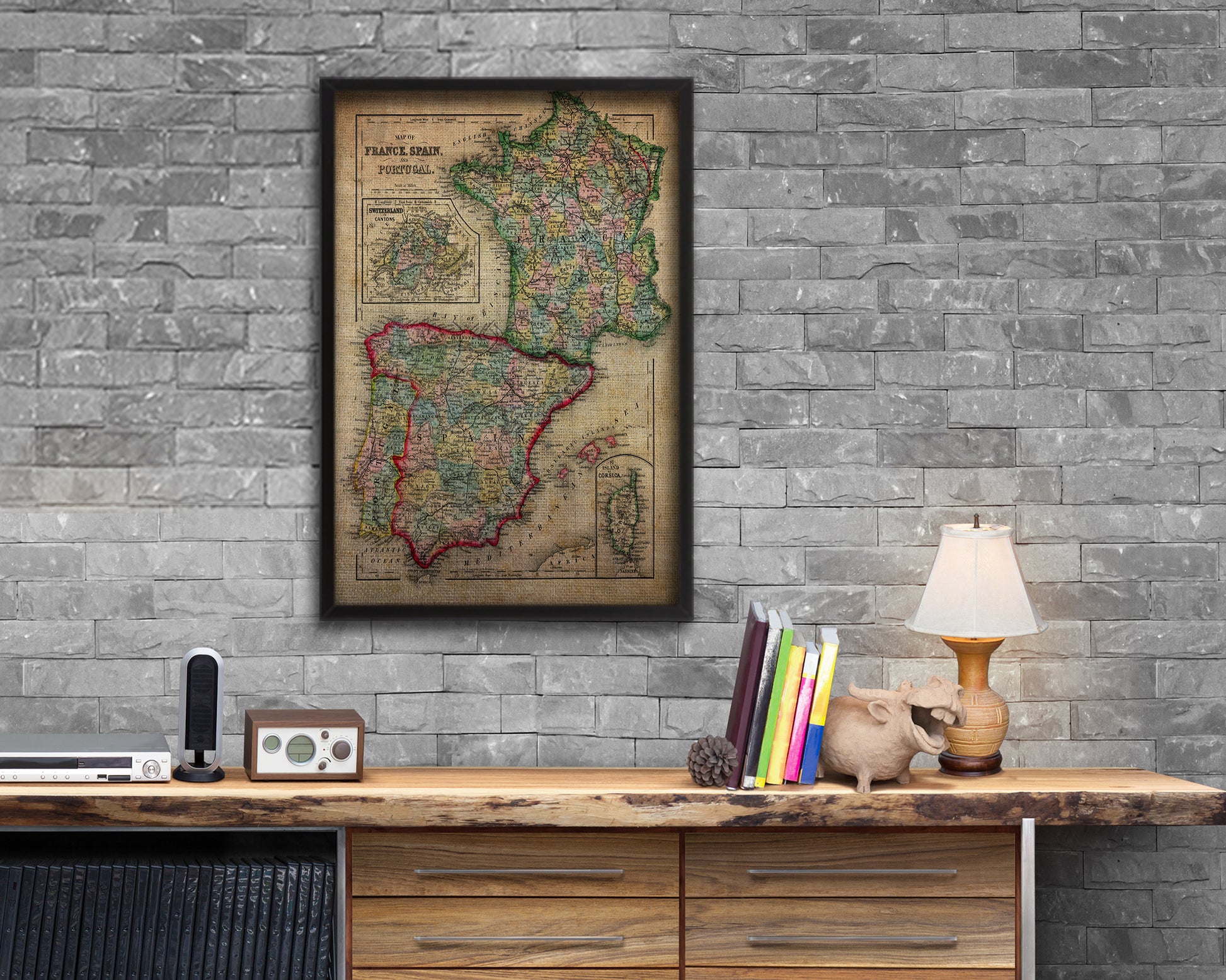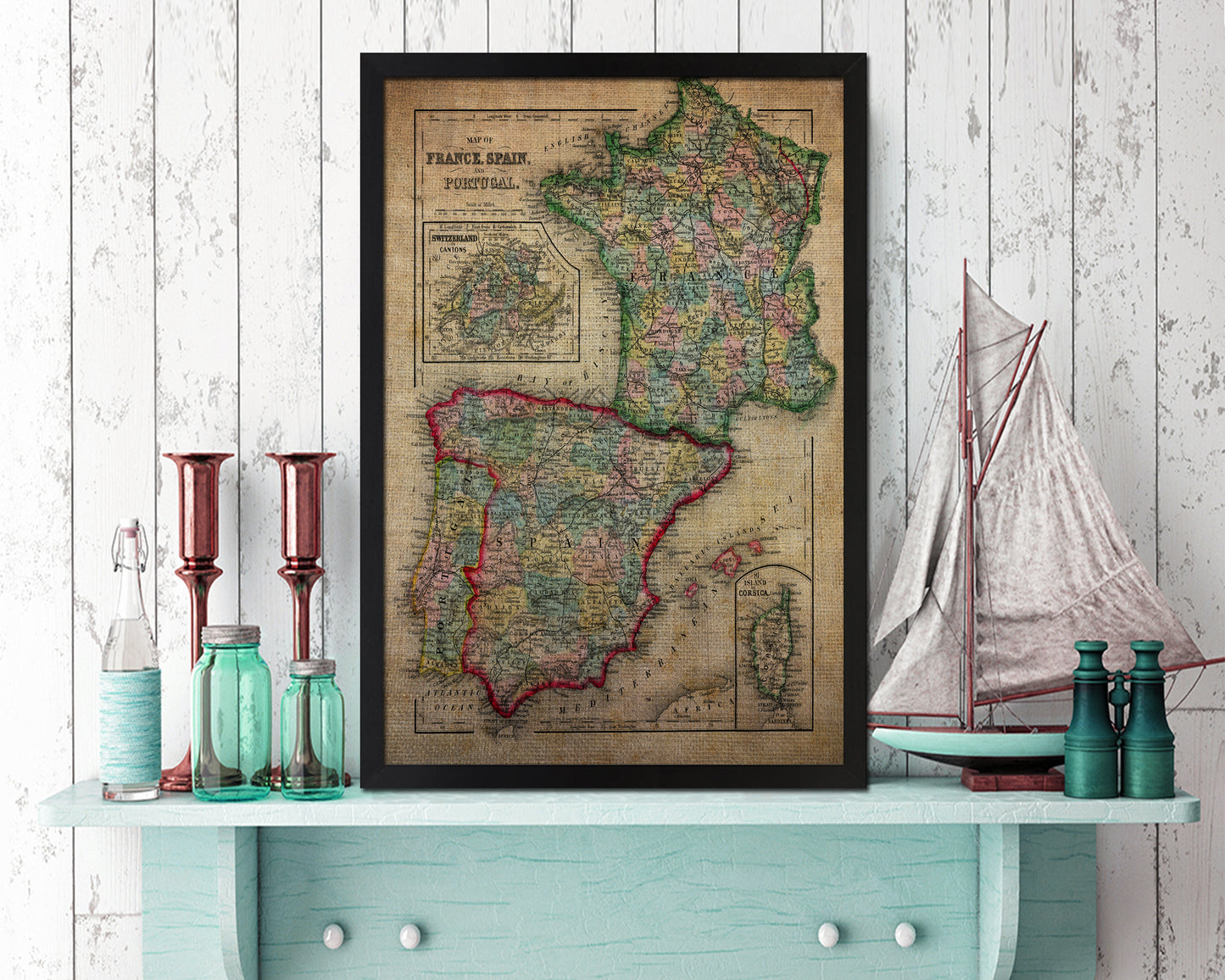 Spain Portugal and France Vintage Map Wood Framed Print Art Wall Decor Gifts